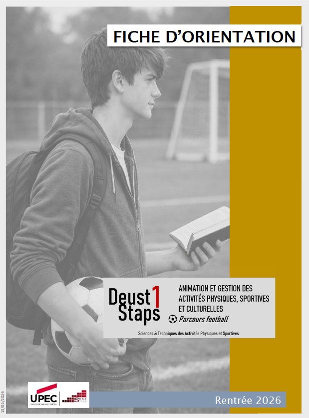 L’UPEC propose une nouvelle formation DEUST AGAPS au sein du département SESS-STAPS. Les candidats intéressés doivent postuler sur Parcoursup et sélectionner : DEUST ANIMATION ET GESTION DES ACTIVITES SPORTIVES ET CULTURELLES - Parcours Football. La Formation s’effectue sur 2 années dans un cursus en apprentissage. Elle est organisée autour de 3 parcours : un parcours universitaire, un parcours fédéral, un parcours associatif. Chacun de ces parcours développe des compétences d’intervention pour un public varié et investi au sein d’une association sportive et particulièrement un club de footballCompétence(s) visée(s)